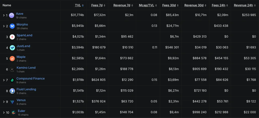 В тройку лидеров по общей заблокированной стоимости также входят Morpho ($5,9 млрд) и SparkLend ($4 млрд).