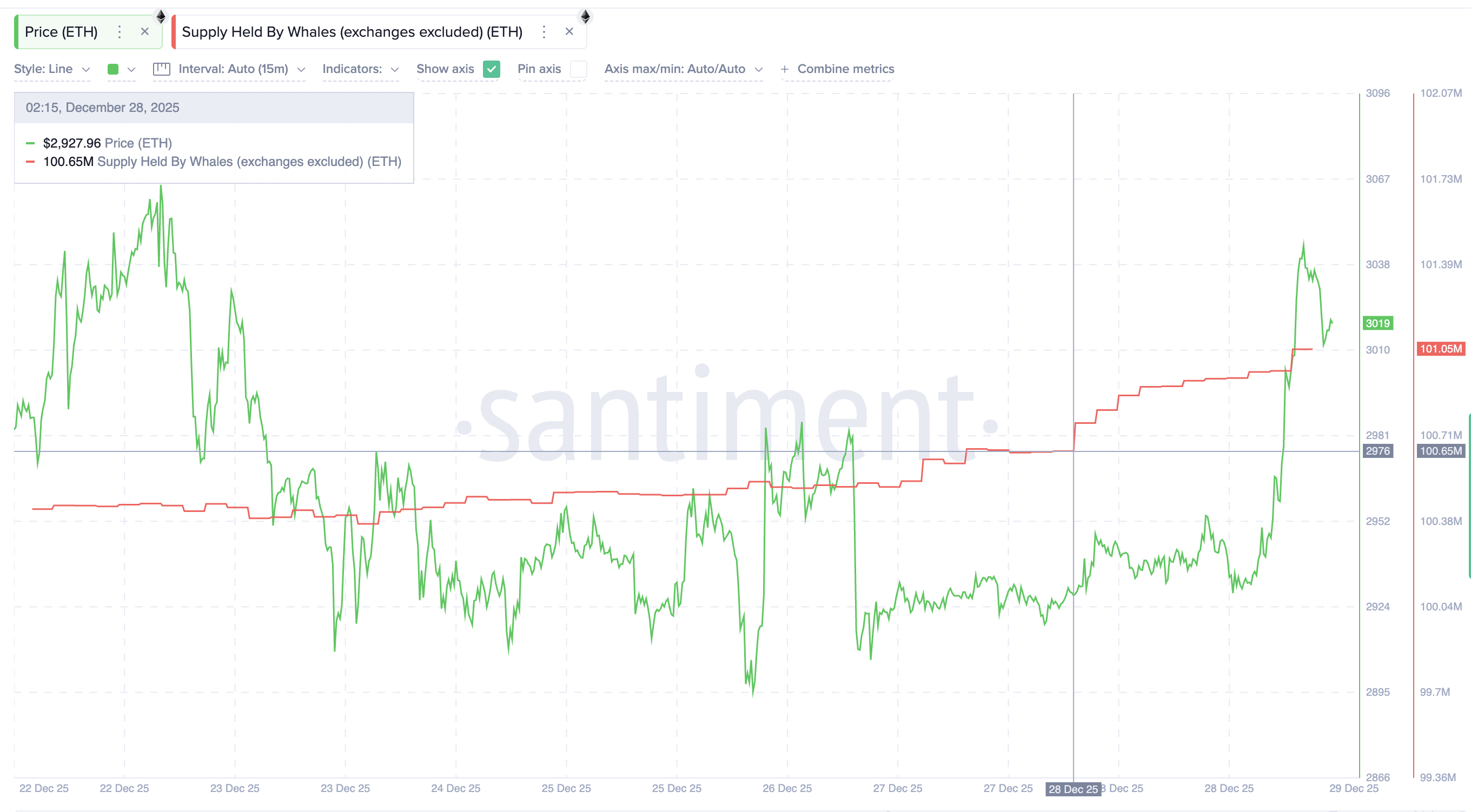 Киты, без учета бирж, увеличили свои запасы с 100,65 млн ETH 28 декабря до 101,05 млн ETH. Эквивалент покупки около 400 000 ETH. При текущей цене это примерно $1,2 млрд, выкупленных менее чем за 24 часа.