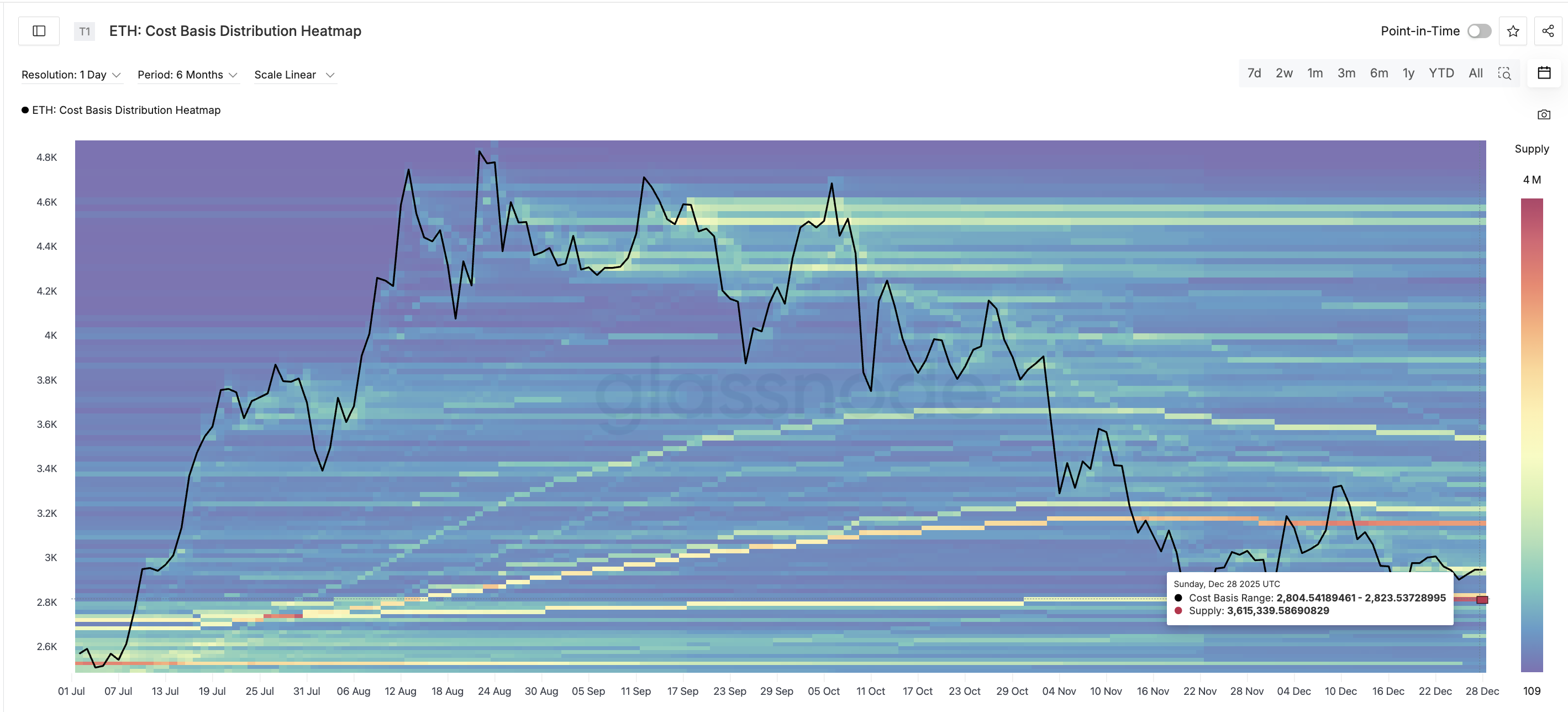 Падение может оказаться нелегким. На тепловой карте стоимости огромное скопление предложения находится между $2 804-$2 823, где хранится около 3,6 миллионов ETH. Именно здесь большая группа инвесторов в последний раз устанавливала позиции. Когда цена возвращается в эту зону, эти участники рынка обычно защищают ее. Именно из-за этого скопления риск пробоя Ethereum все еще сохраняется, но выглядит менее вероятным.