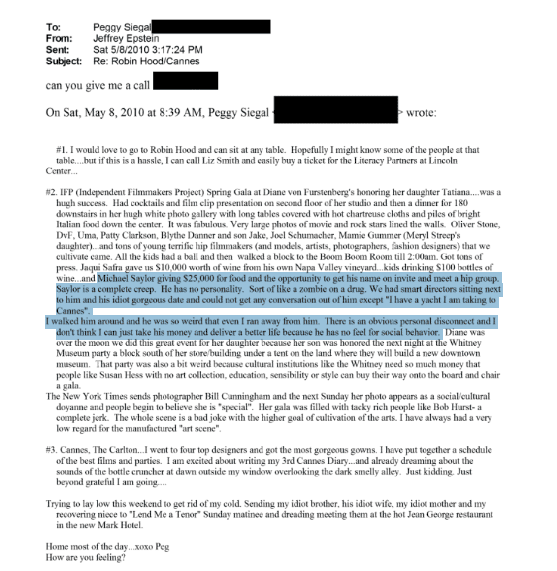 - В материалах упоминается имя Майкла Сэйлора и его контакты с окружением Эпштейна.