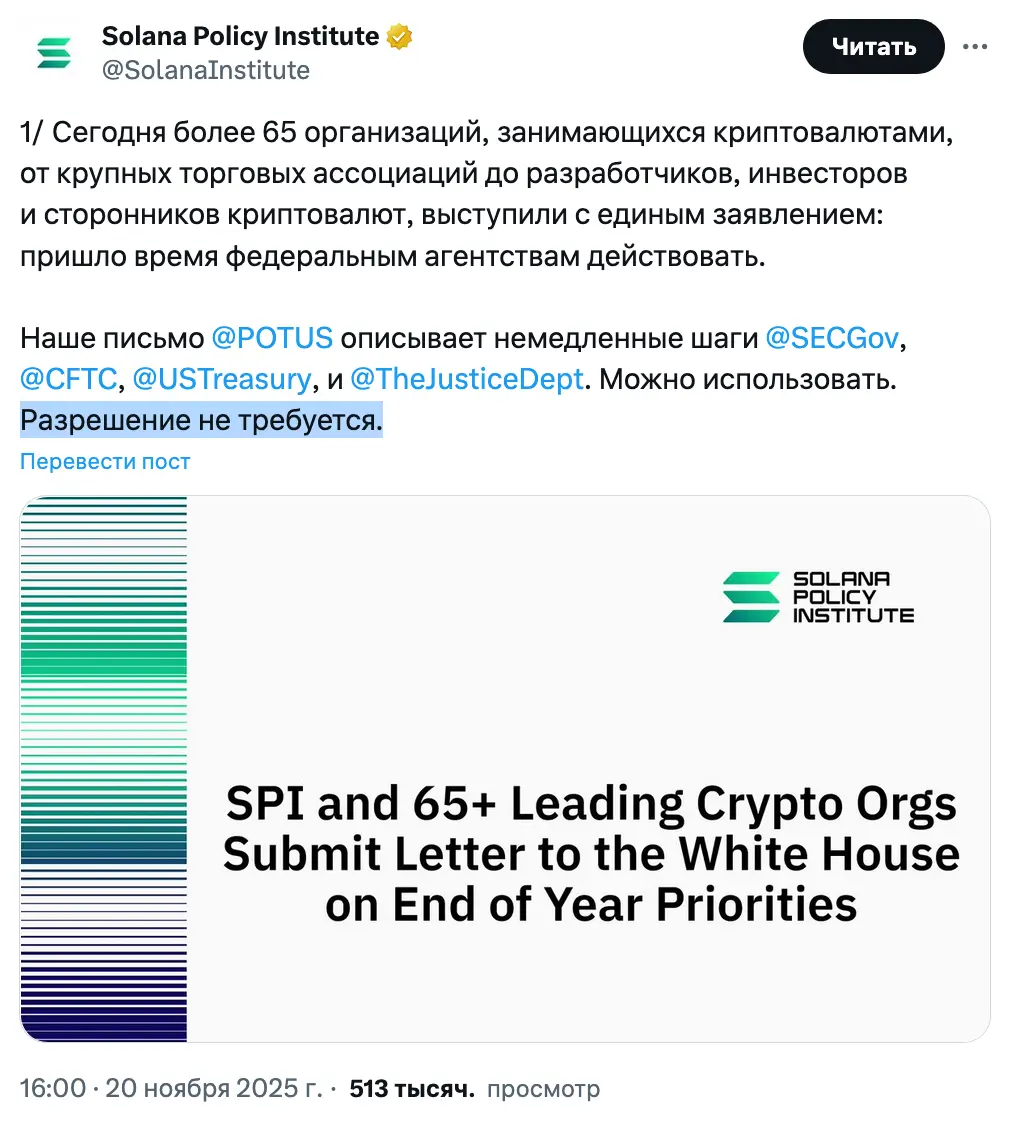 В письме к Трампу, распространенном среди СМИ, правозащитные организации, включая Solana Policy Institute, Blockchain Association и DeFi Education Fund, сформулировали ряд предложений по криптовалютной политике.