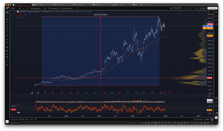 Так, CEG дала инвесторам 850% прибыли без плеча на хайпе ИИ-пузыря. Скучный и неочевидный вариант для тех, кто хочет зарабатывать, а не быть в тренде.