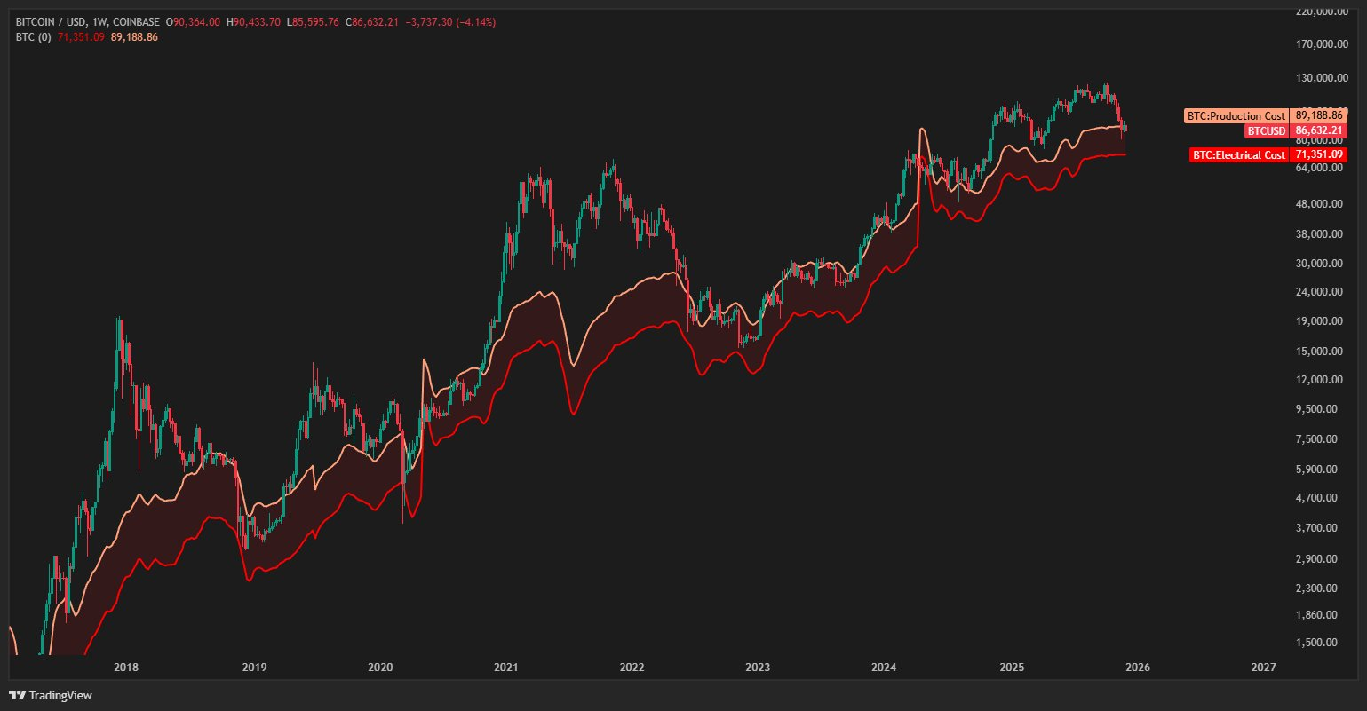 В сообществе обсуждают ориентировочную себестоимость добычи по электричеству — около $71 300. Блогер @Theblockvlog подчеркивает, что показатель меняется вместе с обновлением ASIC, миграцией ферм и перераспределением мощности. Он уже снижался в прошлые циклы. Рассматривать его как устойчивую нижнюю границу нельзя. На фоне падения хешпрайса эта отметка остается только ориентиром.
