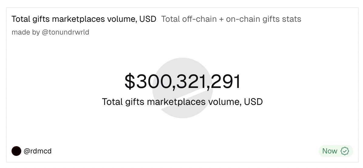 Рынок невзаимозаменяемых токенов (NFT) Telegram Gifts, работающий на блокчейне The Open Network (TON), достиг впечатляющего рубежа. По данным Dune Analytics, общий объем торгов на платформе преодолел отметку в $300 млн.