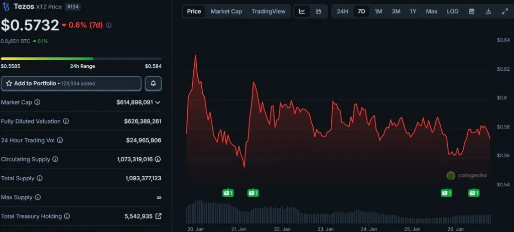 Котировки нативного токена XTZ не отреагировали на очередной апгрейд Tezos. На фоне общей волатильности рынка актив торгуется на уровне ~$0,58 при капитализации около $615 млн. Курс уступает достигнутому в октябре 2021 года историческому максимуму на отметке $9,12 почти 94%.