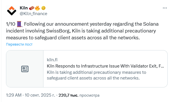 Эта «мера предосторожности» была предпринята после кражи стейкинговых Solana на сумму $41 млн из кошелька, управляемого Kiln. Средства принадлежали компании SwissBorg, для которого Kiln выступал «партнёром по стейкингу».