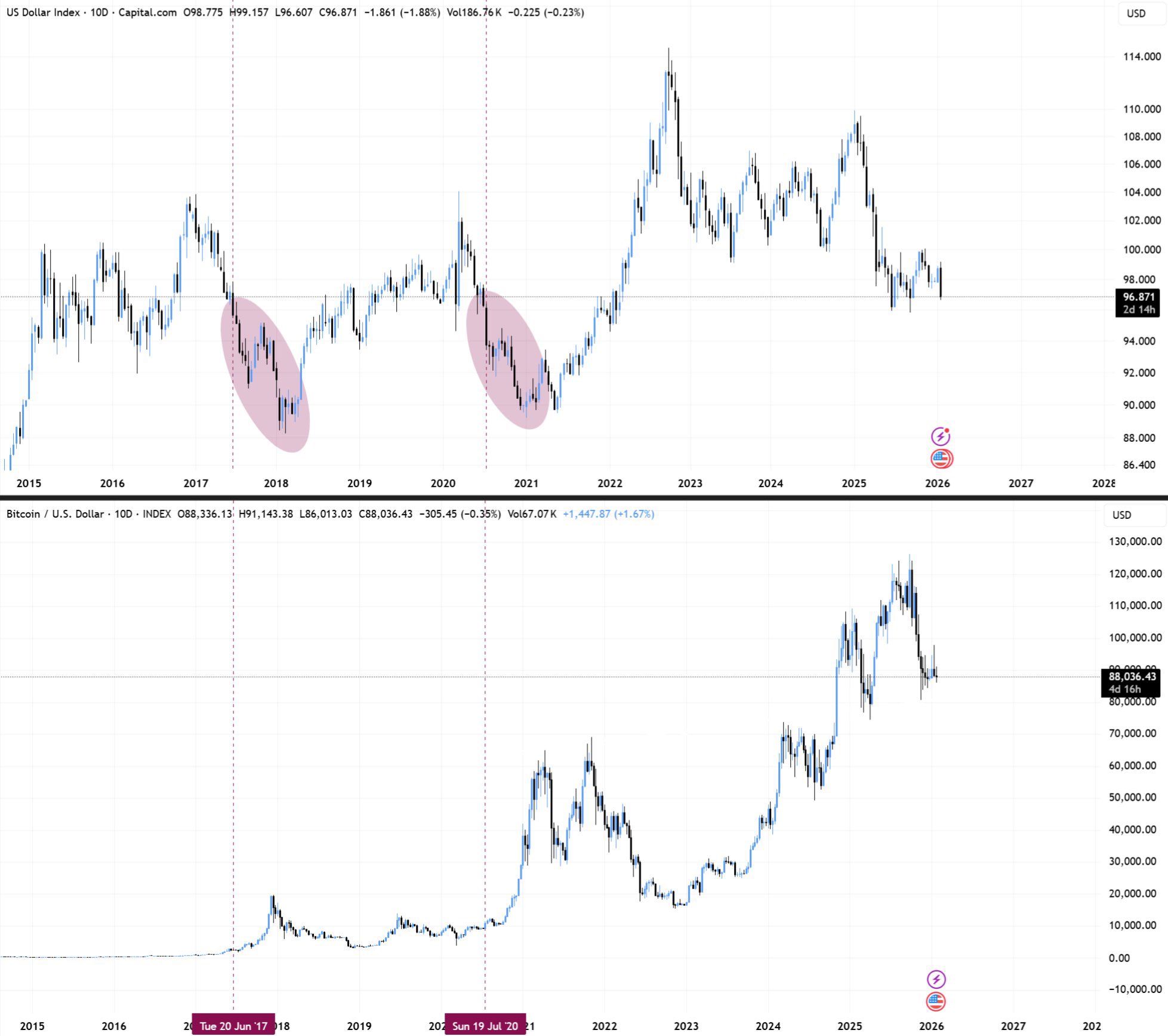 DXY и десятичасовой график биткоина. Источник: BitBull.