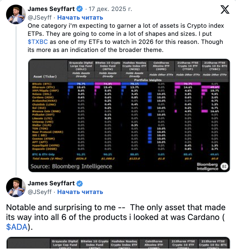Вторым важным фактором является статус ADA в структуре криптовалютных индексных продуктов (ETP). Аналитик Джеймс Сейффарт провел исследование рынка, которое показало уникальное положение Cardano. Согласно его данным, ADA стал единственным активом, включенным во все шесть изученных им индексных корзин.