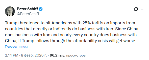 Экономист Питер Шифф опубликовал в социальной сети предупреждение о возможном повышении тарифов президентом Дональдом Трампом, что, по его мнению, негативно скажется на американских потребителях.