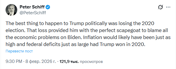 Лучшее, что случилось с Трампом в политическом плане, — это поражение на выборах 2020 года. Оно предоставило ему идеального козла отпущения, свалив все экономические проблемы на Байдена. Инфляция, вероятно, была бы такой же высокой, а федеральный дефицит таким же большим, если бы Трамп победил в 2020 году, — написал Питер Шифф.