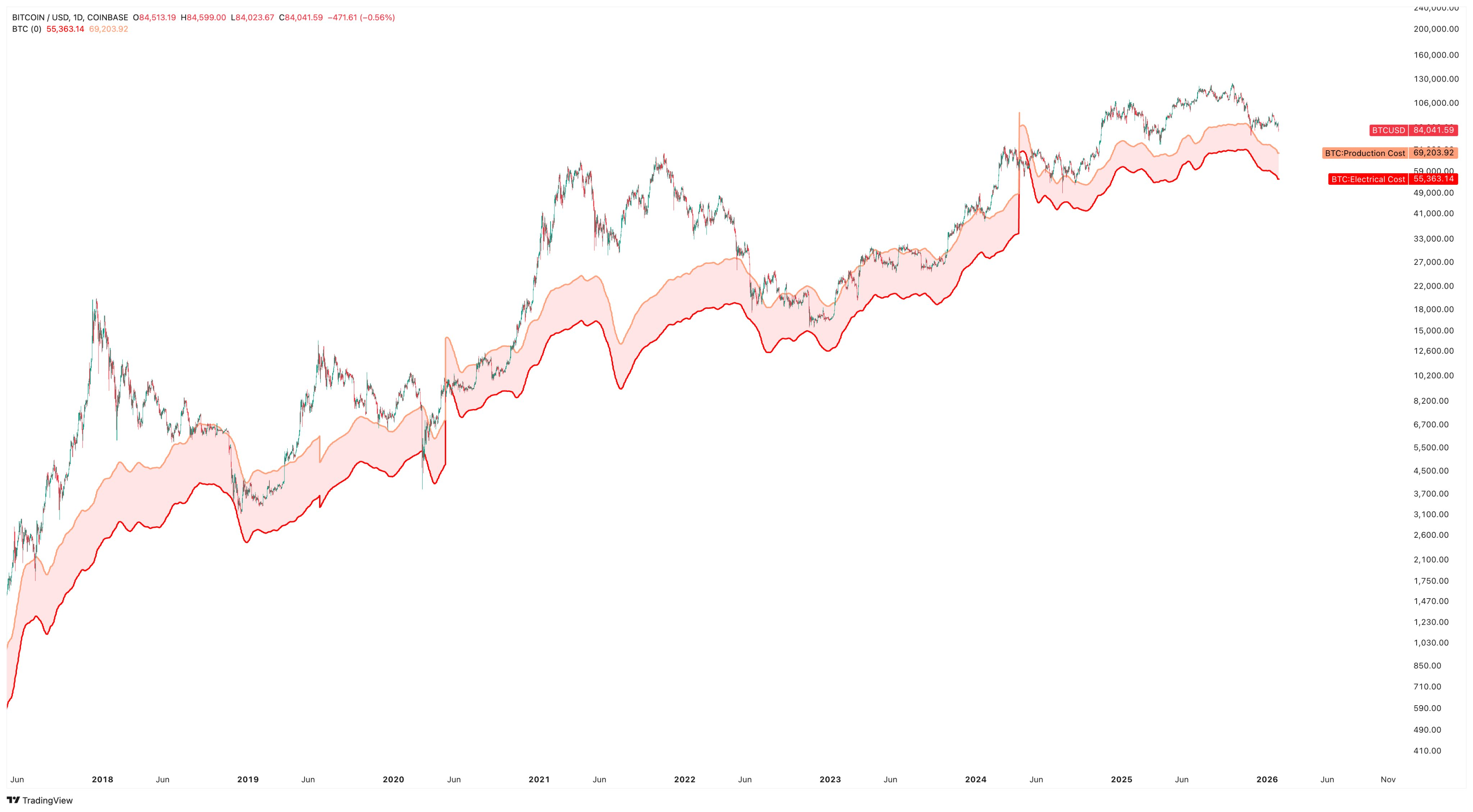 Давление со стороны предложения усиливается через майнинг. По расчетам Чарльза Эдвардса, инвестора и основателя фонда Capriole, производственная себестоимость добычи опустилась к зоне около $69 000, а электрическая — к $55 000.