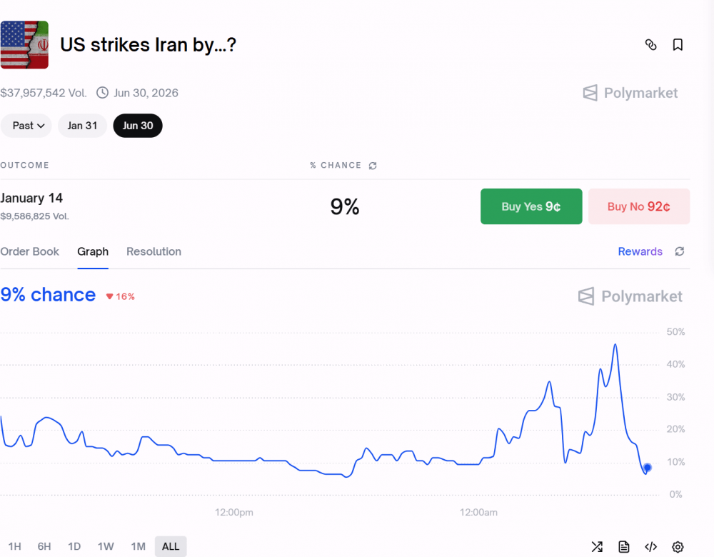 На платформе прогнозов Polymarket появился новый крупный депозит: трейдер поставил $40 000 на то, что США нанесут удар по Ирану до конца 14 января. При этом большинство участников рынка считают, что возможная атака произойдет позже — к концу месяца или максимум к 30 июня.
