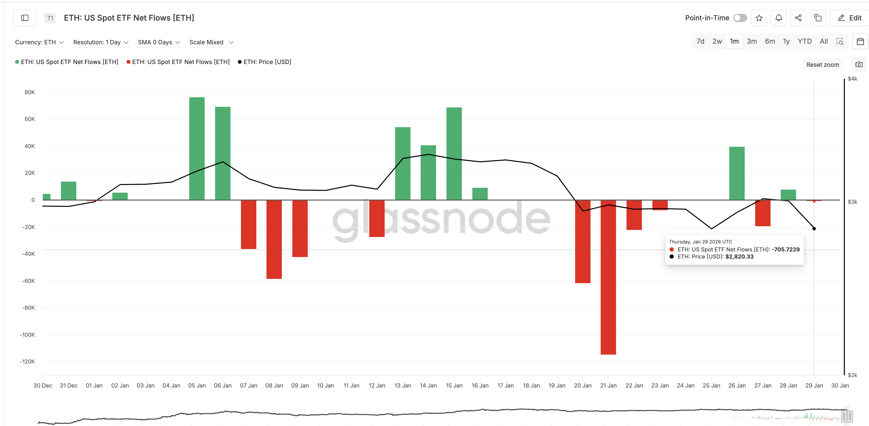 Поведение долгосрочных инвесторов также выглядит неоднозначно. В январе наблюдался чистый приток активов на кошельки держателей, однако темпы накопления снизились. Если 18 января объем покупок составлял около 338 700 $ETH, то к концу месяца он сократился более чем на 55%. Это свидетельствует о снижении уверенности покупателей в текущих ценовых уровнях.