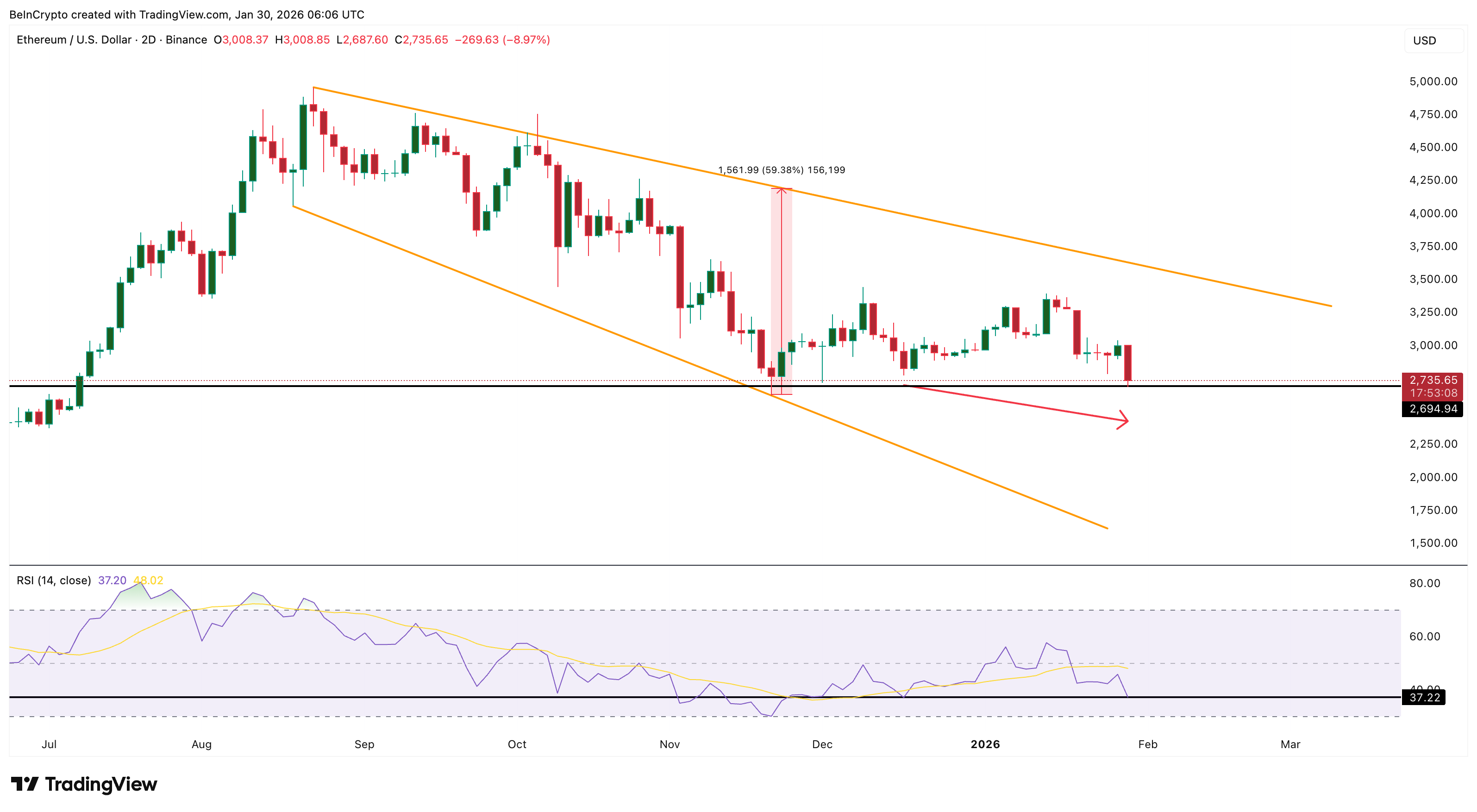 Индикатор относительной силы (RSI) указывает на формирование бычьей дивергенции. В период с середины декабря по конец января цена обновляла минимумы, тогда как значения RSI стабилизировались. Это классический признак истощения нисходящего тренда. Если курс удержится выше отметки $2690, вероятность разворота существенно возрастет.