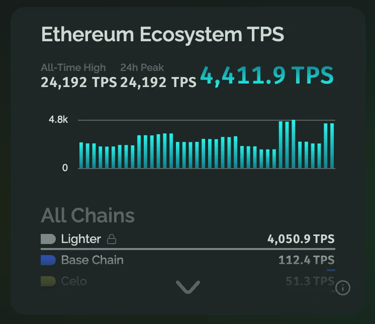 Экосистема Ethereum зафиксировала новый исторический максимум по количеству транзакций в секунду (TPS). После включения в статистику данных L2-сети от децентрализованной биржи Lighter показатель достиг 24 192, согласно Growthepie.