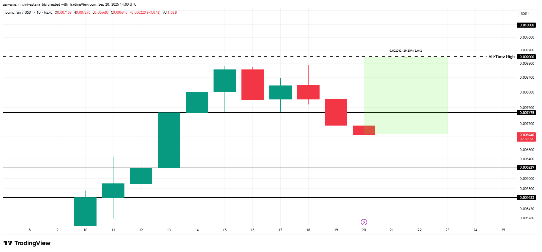 С другой стороны, PUMP может переломить медвежий сценарий, если превратит уровень $0,0074 в поддержку. Это даст токену импульс для возвращения к историческому максимуму $0,0090, при условии, что инвесторы продолжат поддерживать актив.