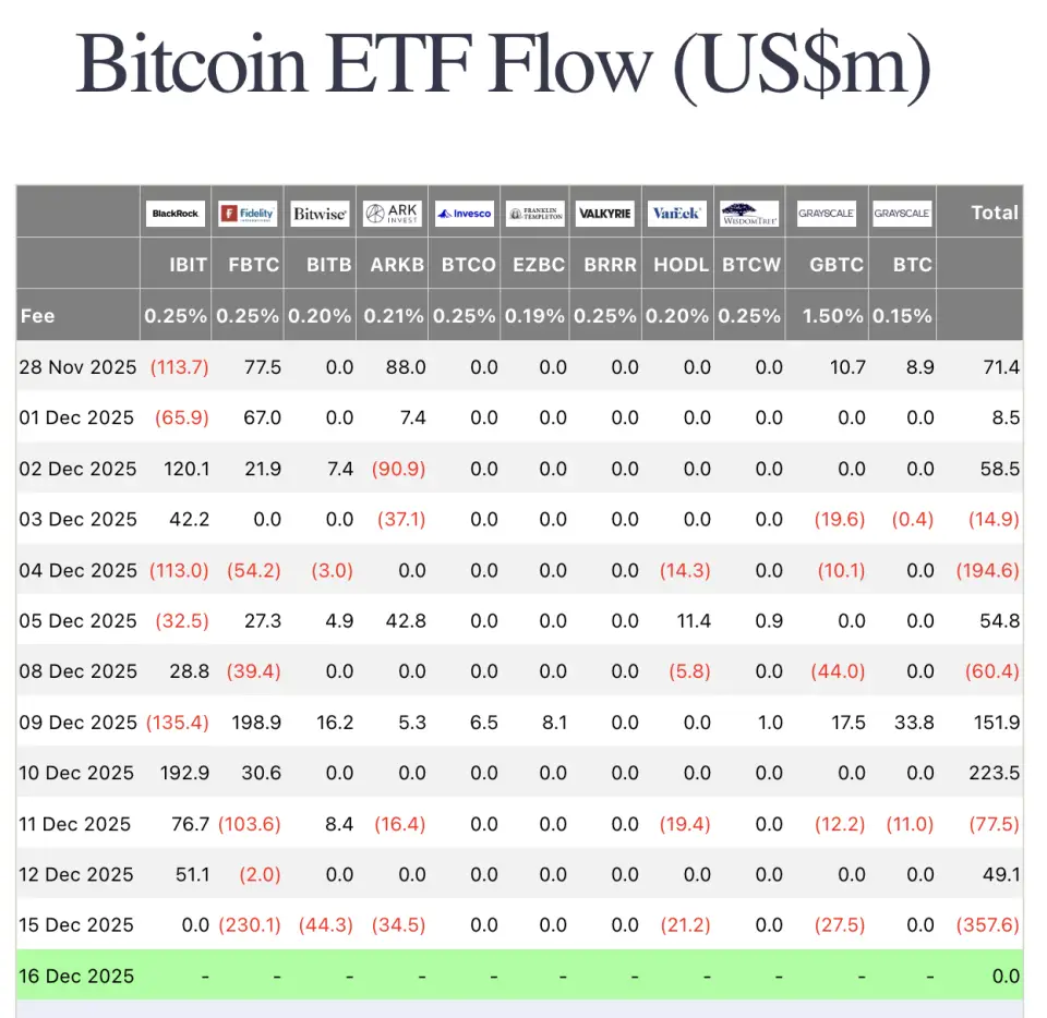 Биткоин 15–16 декабря потерял около 5% стоимости, опускавшись до $85120. Падение первой криптовалюты могла спровоцировать распродажа актива корпоративными инвесторами и значительный отток средств из спотовых ETF на биткоины, сообщили аналитики платформы Farside.
