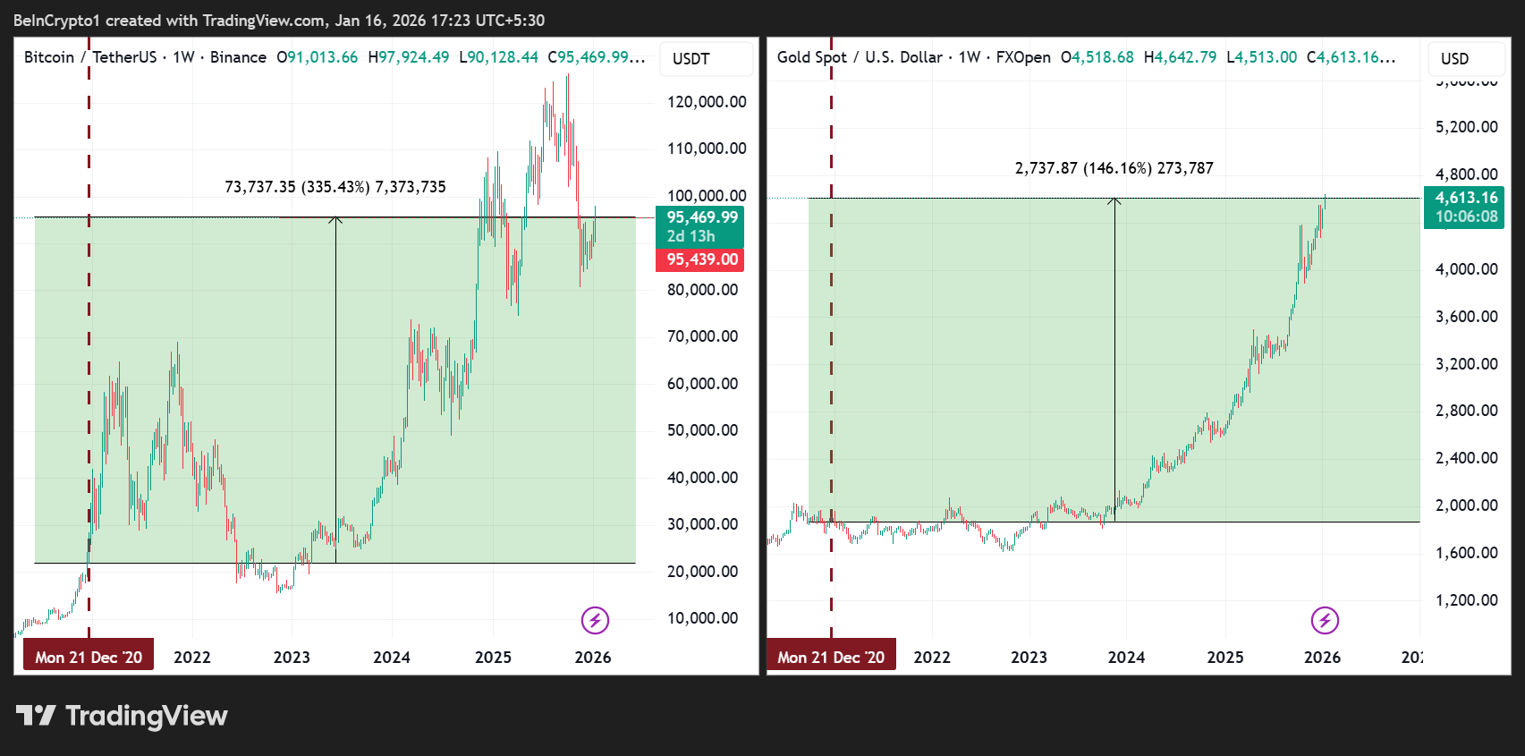 Динамика цены биткоина и золота с момента первой инвестиции Кэти Вуд. Источник: TradingView