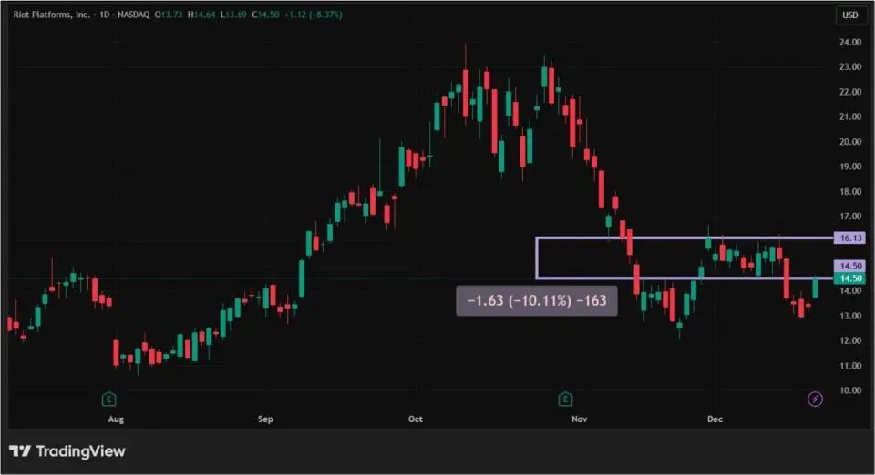 Открывает десятку крупнейших криптокомпаний Riot Platforms, занимающаяся майнингом и развитием дата-центров, с рыночной капитализацией $5,39 млрд. Ее акции в первые две декады декабря снизились на 10,11%. До 12 числа ценные бумаги Riot Platforms торговались в боковике. В связи с этим нельзя сказать, что решение ФРС снизить ставку на 0,25% сыграло определяющую роль. Акции упали вслед за биткоином, который опустился ниже $90 000. Кроме того, инвесторы все еще «переваривают» новость о расширении деятельности компании с майнинга до развития дата-центров.