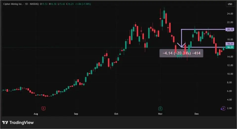 Девятой в списке крупнейших криптокомпаний стала Cipher Mining, фокусирующаяся на майнинге и развитии технологий искусственного интеллекта, с рыночной капитализацией $6,4 млрд. В первые две трети декабря ее акции снизились сразу на 20,34%. Как и в случае с Riot Platforms, нельзя сказать, что определяющим стало недовольство инвесторов действиями ФРС. В основном, опасения держателей акций Cipher Mining связаны с увеличением долга компании на $1,4 млрд после выпуска облигаций, о котором было объявлено еще 5 ноября. Собственно, с тех пор ценные бумаги CIFR и перешли к коррекции, потеряв более 36% от исторического максимума в $25,52. Падение биткоина в декабре также не добавило инвесторам оптимизма.