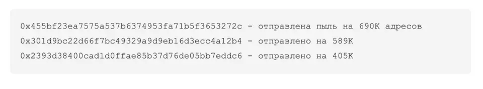По мнению специалиста по безопасности, используя «атаку пылью», злоумышленники сначала переводят небольшие суммы на специальные адреса, «распределители пыли». Затем с этих кошельков начинают рассылать микротранзакции миллионам потенциальных жертв, создавая у тех записи в истории операций. Расчет мошенников: пользователи, копируя адреса для перевода средств из истории, случайно выбирают мошеннический адрес, визуально похожий на нужный, и тем самым отправляют средства злоумышленникам.