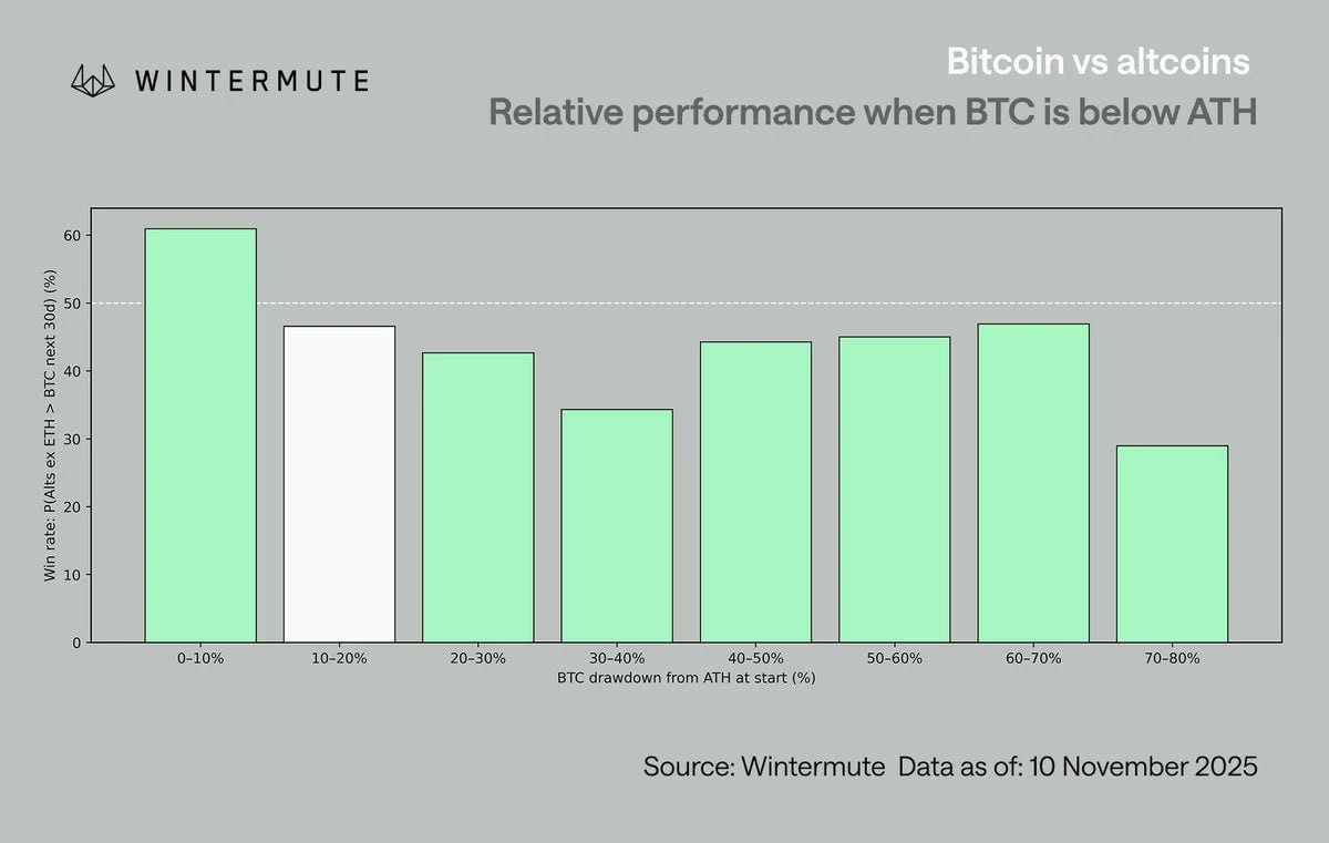 На графике показана относительная доходность альткоинов по отношению к биткоину в зависимости от степени отклонения BTC от исторического максимума (ATH). Ось X: Насколько далеко биткоин находится от ATH в процентах. Ось Y: Частота (в %) того, что альткоины (без учета ETH) показывают более высокую доходность, чем BTC, в течение следующих 30 дней. Источник: Wintermute