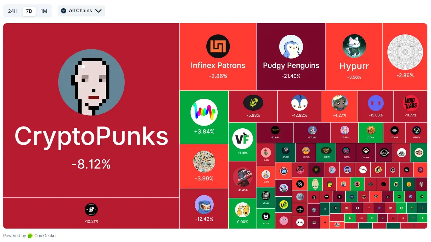 CryptoPunks, крупнейшая коллекция NFT по рыночной капитализации, снизилась на 8% на недельном интервале и почти на 5% за последние 30 дней.