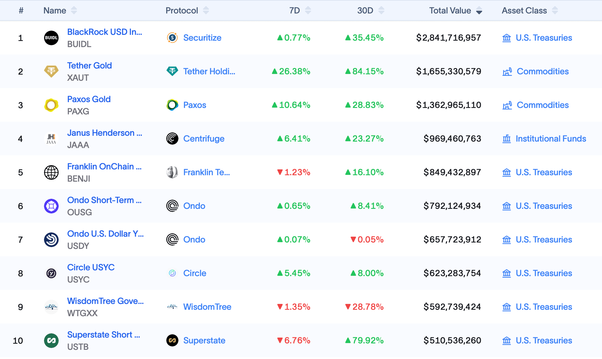 В товарах Tether Gold (XAUT) вырос на 26,38% (7D) и 84,15% (30D) до 1,66 миллиарда долларов, Paxos Gold (PAXG) вырос на 10,64% (7D) и 28,83% (30D) до 1,36 миллиарда долларов, и JSOY OIL продвинулся на 2,00% (7D) и был стабильным за 30 дней с 313,34 миллиона долларов. Государственные и неамериканские суверенные продукты включают China AMC USD (CUMIU) с ростом на 0,20% (7D, 30D) до 503,10 миллиона долларов и Spiko EU T-Bills (EUTBL) с ростом на 0,57% (7D) и падением на 0,85% (30D) до 324,58 миллиона долларов.