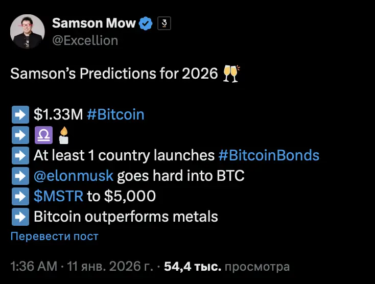 По словам Моу, американский мультимиллиардер в 2026 году «серьезно возьмется за биткоин». Основатель Jan3 верит, что первая криптовалюта может достичь $1,33 млн, то есть вырасти примерно на 1367%.