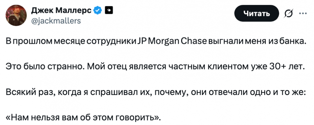 В ноябре Джек Маллерс, генеральный директор компании Strike, занимающейся платежами в биткоине, заявил, что банк JPMorgan лишил его банковских услуг без объяснения причин.
