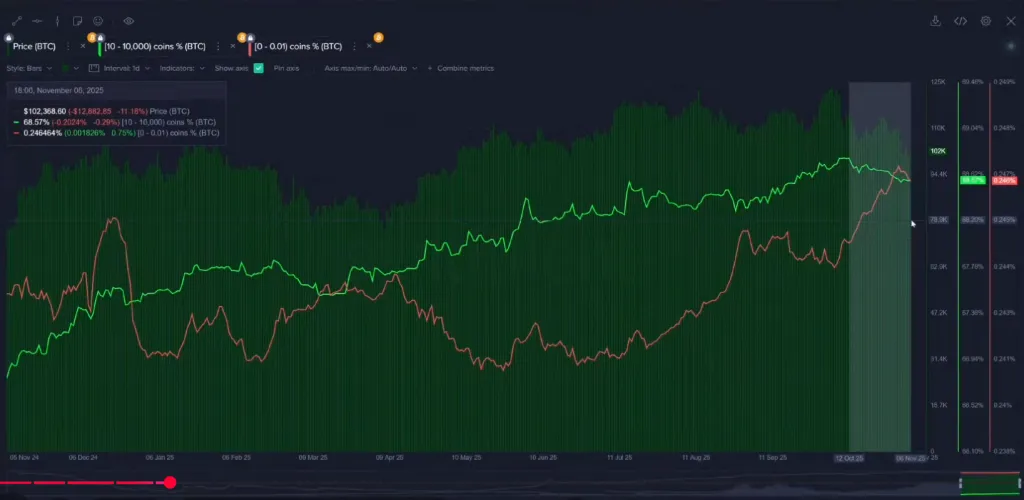 С 12 октября киты продали 32 500 BTC, тогда как мелкие инвесторы активно покупали на спаде. Такое расхождение в поведении выступает предупреждающим сигналом для биткоина, отметили эксперты Santiment.