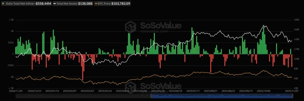 По данным SoSoValue, 6 ноября спотовые биржевые биткоин-фонды после шести дней непрерывного оттока капитала привлекли $240 млн. Однако уже на следующий день инвесторы вывели из продуктов более $558 млн.