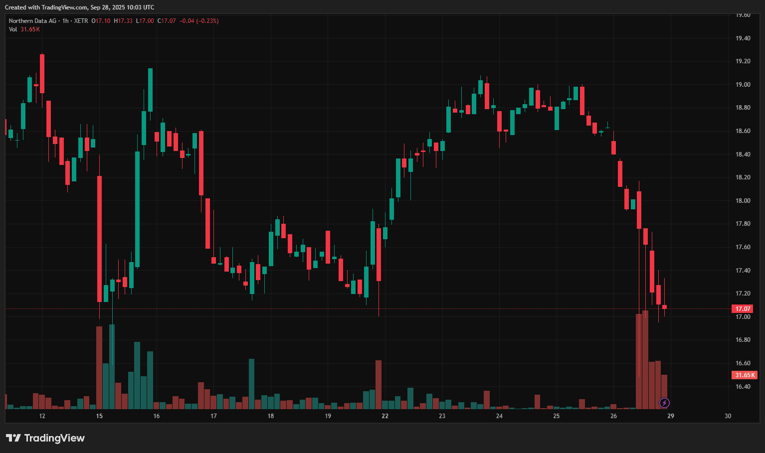 Инвесторы отреагировали на новости распродажей ценных бумаг фирмы. Акции Northern Data упали на 10,7%. На момент публикации материала они торгуются по €17, согласно TradingView.