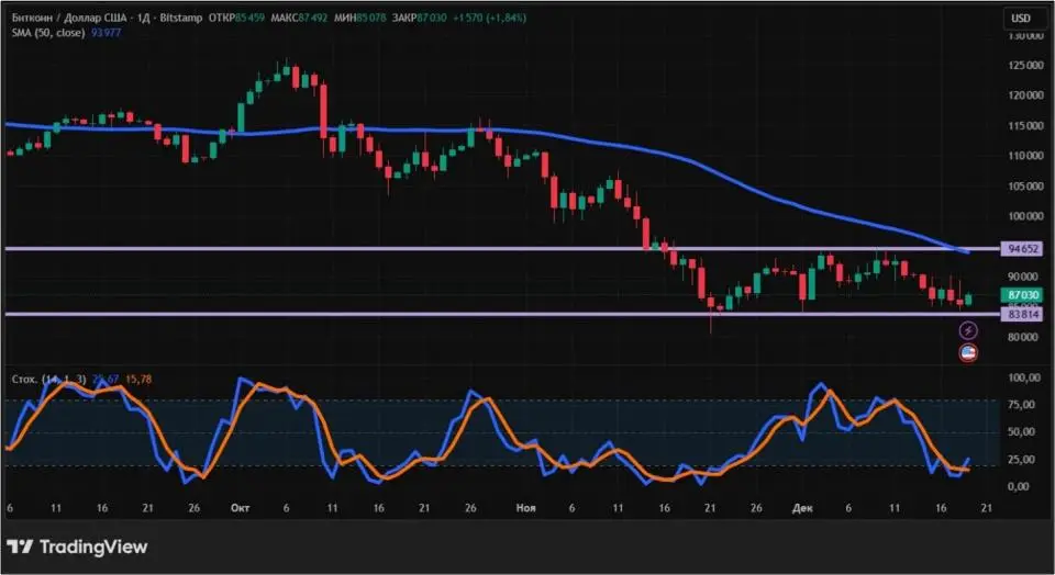С точки зрения технического анализа, тренд биткоина — нисходящий. Цена расположена ниже 50-дневной скользящей средней (отмечена синим цветом). Из позитивного можно отметить достижение стохастиком зоны перепроданности (ниже значения 20) и начало разворота. Чаще всего это позитивный сигнал для покупателей, сигнализирующий о скором возможном росте. Ближайшие уровни поддержки и сопротивления на дневном графике: $83814 и $94652 соответственно.