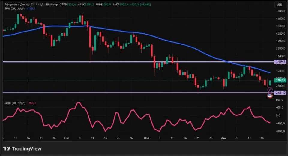 Согласно техническому анализу, тренд эфира остается нисходящим. Цена расположена ниже 50-дневной скользящей средней (обозначена синим цветом), а индикатор Momentum имеет отрицательное значение. Ближайшие уровни поддержки и сопротивления на дневном графике: $2621 и $3449,8 соответственно.