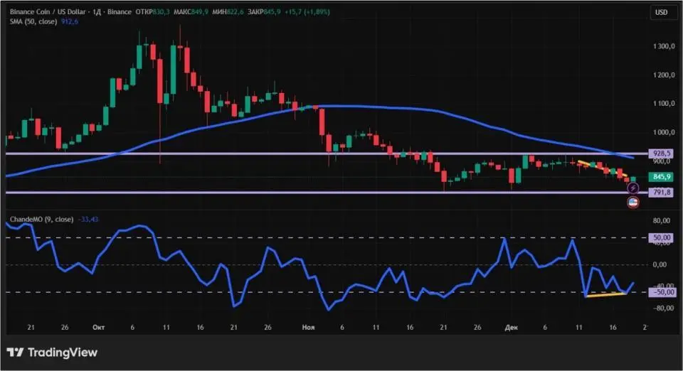 С точки зрения технического анализа, торговля BNB последний месяц проходит в боковике между уровнем поддержки $791,8 и уровнем сопротивления $928,5. Если взглянуть на индикаторы, ситуация тоже неоднозначная. С одной стороны, цена находится ниже 50-дневной скользящей средней (отмечена синим цветом) — это явный медвежий сигнал. С другой, Chande Momentum Oscillator (CMO) с 12 по 18 декабря сформировал бычью дивергенцию (падение стоимости BNB с одновременным ростом индикатора, отмеченное желтыми линиями). А это уже говорит в пользу покупателей. Кроме того, 18 декабря CMO опускался в зону перепроданности (ниже -50), что также бычий сигнал.