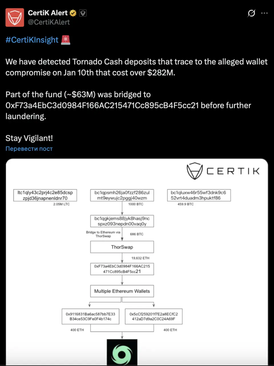 Генеральный директор специализирующейся на блокчейн-безопасности компании FearsOff Марван Хэчем (Marwan Hachem) уточнил: это типичная для крупномасштабного отмывания средств схема, особенно при кросс‑чейн кражах с участием BTC и LTC. По его словам, использование децентрализованной биржи THORswap для конвертации биткоинов в эфир и последующее дробление средств на порции перед отправкой в миксер — классический подход.