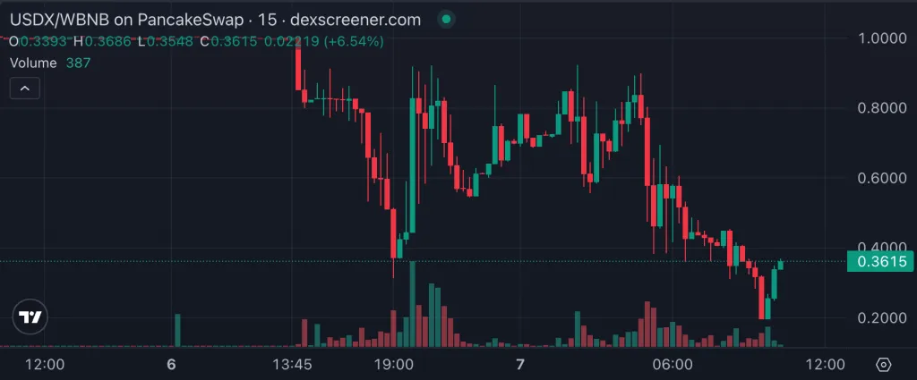 15-минутный график USDX/WBNB на PancakeSwap. Источник: DEX Screener.
