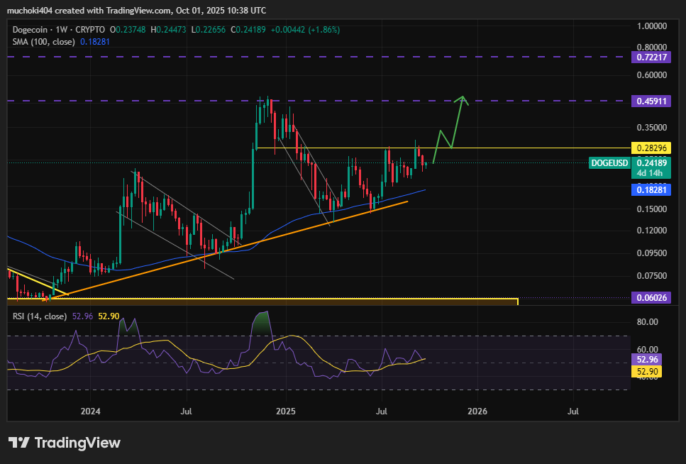 За последние три месяца Dogecoin неоднократно сталкивался с отскоками вблизи уровня сопротивления $0,28. По данным TradingView, токен закрыл сентябрь на отметке $0,23, а затем отскочил до $0,244, увеличившись на 6% за 24 часа.