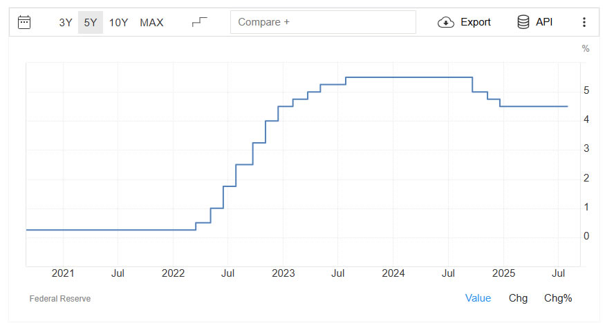Процентные ставки в США были высокими с начала 2022 года. Источник: TradingEconomics.