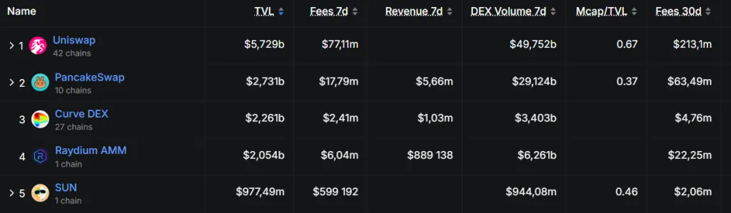 Примечателен отрыв от главного конкурента — PancakeSwap. По объему комиссионного дохода за месяц ведущая DEX лидирует с показателем $213 млн против $63 млн.