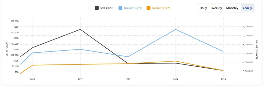 В 2025 году объём продаж NFT составил около $5,63 млрд, что примерно на 37% меньше $8,9 млрд, зафиксированных в прошлом году. Средние цены продаж также снизились по сравнению с прошлым годом и составили $96 вместо $124.
