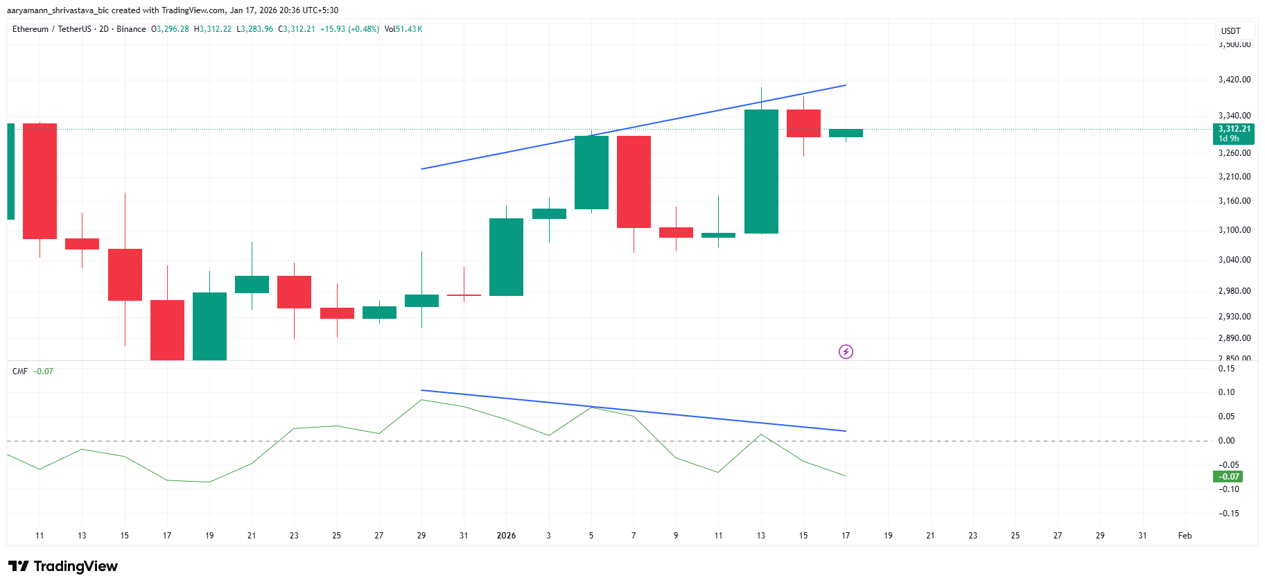 Последние три недели для Ethereum четко прослеживается медвежья дивергенция, которая сигнализирует об ослаблении внутренней динамики. Пока цена ETH обновляла максимумы, ончейн-индикатор Chaikin Money Flow показывал рост нисходящих минимумов. Подобное сочетание говорит о том, что рост котировок сопровождался не притоком, а оттоком капитала.