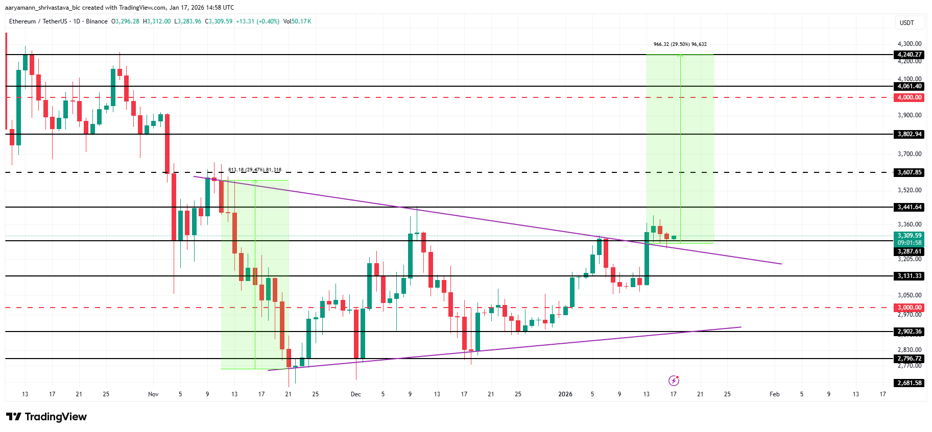Ethereum торгуется около $3 309 и держится чуть выше поддержки на $3 287. Недавний выход из треугольника обозначил возможный рост на 29,5% — до $4 240. Однако ослабление импульса и медвежья дивергенция могут разрушить бычью структуру.