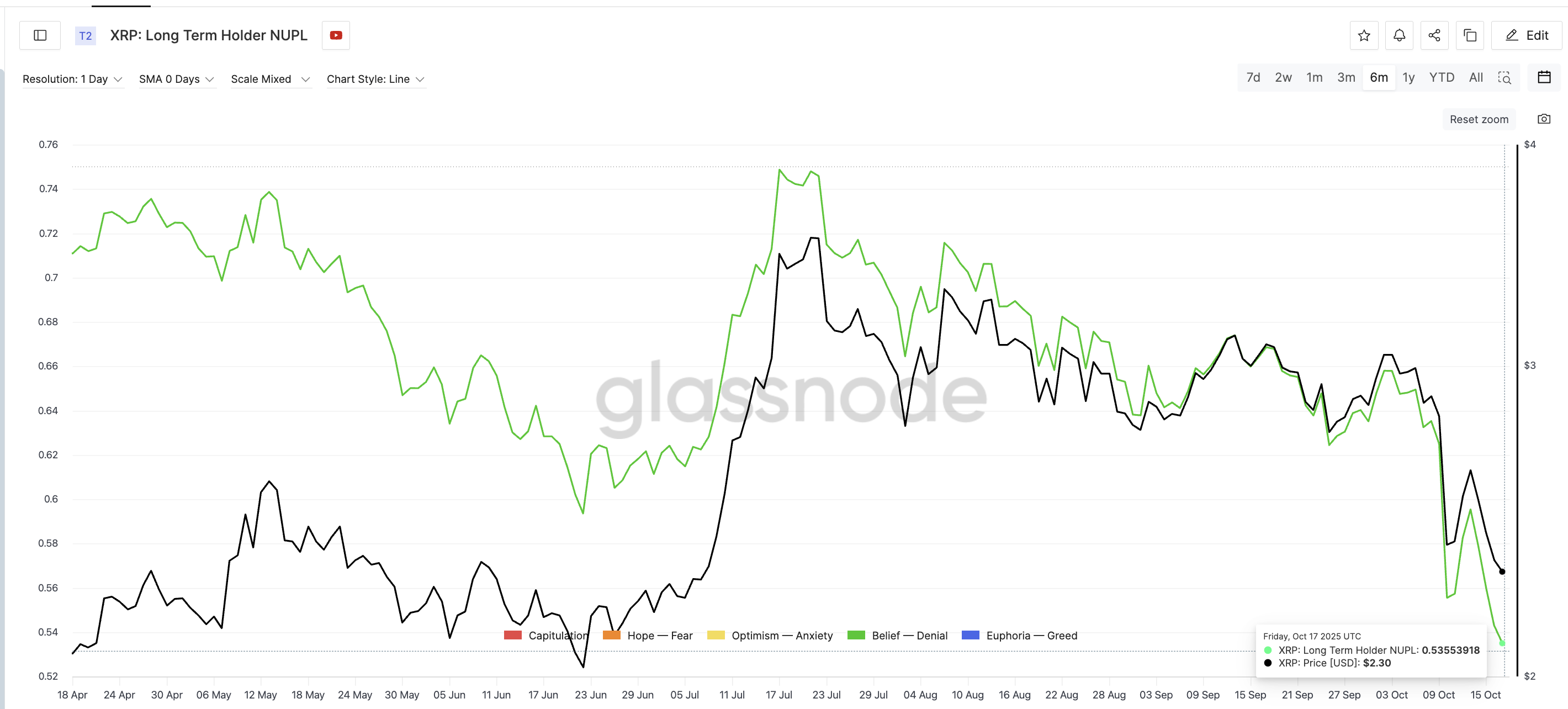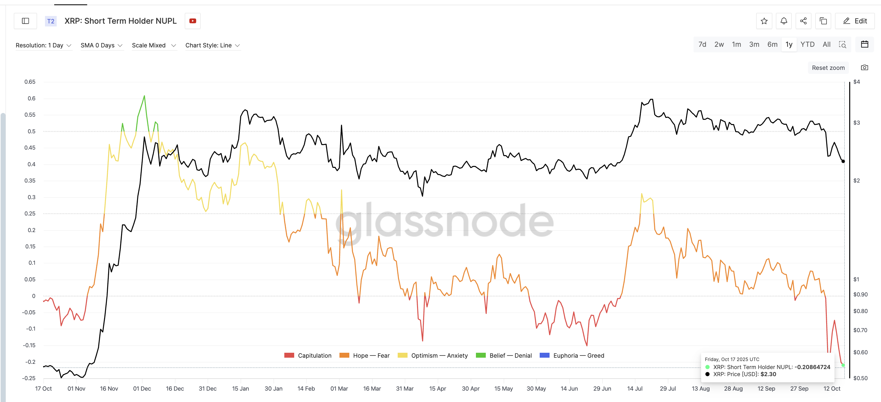 По данным Glassnode, краткосрочный NUPL для XRP опустился до годового минимума –0,20 при цене около $2,30.