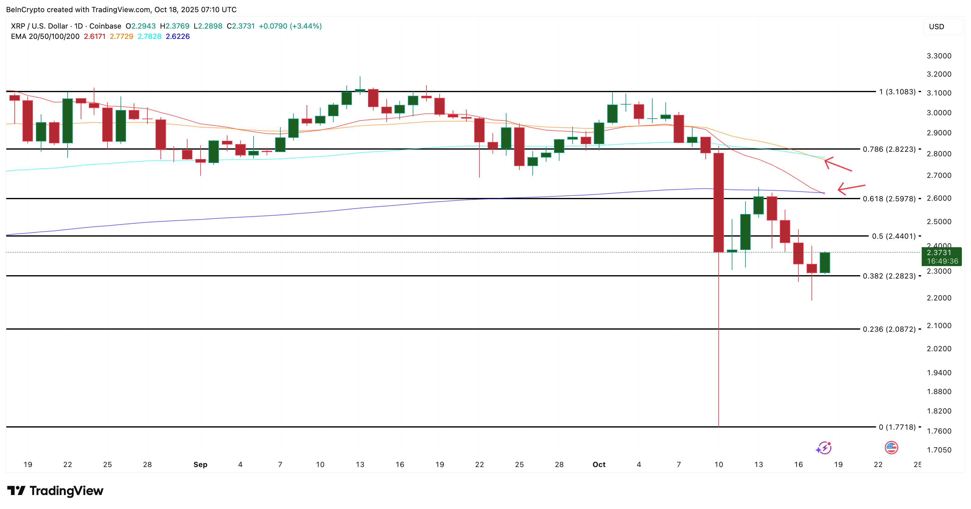 На момент публикации XRP торгуется около $2,35. Закрытие дня выше $2,44 станет первым техническим подтверждением силы, а прорыв $2,59 (зона 200-дневной EMA) откроет путь к $2,82 и $3,10.
