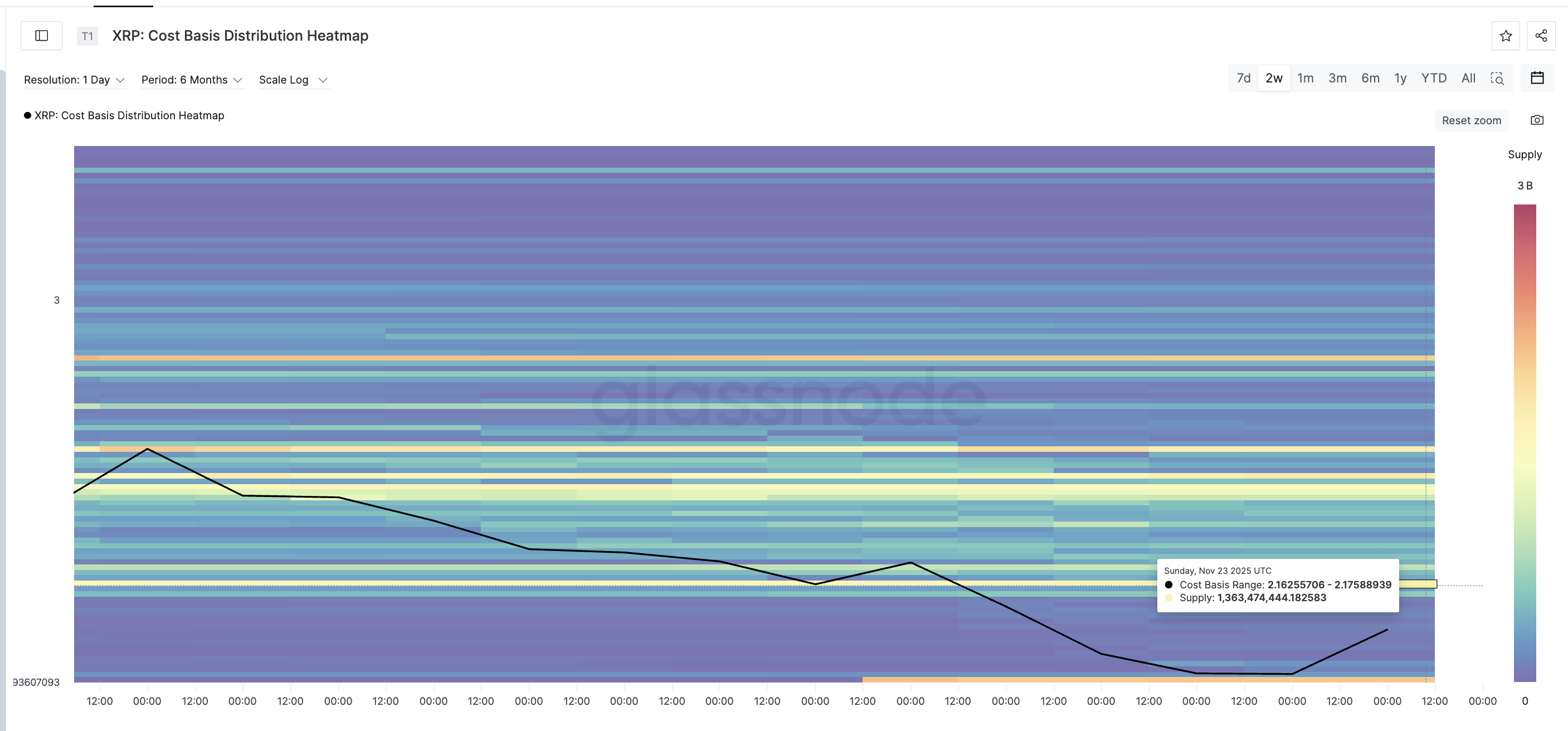 Дополнительное давление исходит от зоны предложения над текущей ценой. Тепловая карта стоимости активов показывает плотный кластер ордеров в диапазоне 2,16$–2,17$. В этой зоне сосредоточено около 1,36 млрд XRP, что эквивалентно 2,86$ млрд. Поскольку эти держатели находятся вблизи безубытка, они могут реализовывать активы при малейшем восстановлении.