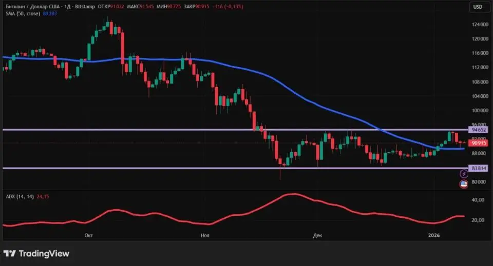 С точки зрения технического анализа, биткоин остается в боковике между уровнем поддержки $83 814 и уровнем сопротивления $94 652. Слабость тренда подтверждается низким значением (меньше 25) индикатора ADX. Тем не менее, с начала января ситуация несколько изменилась по сравнению с концом 2025 года. Инициатива перешла от продавцов к покупателям. Об этом свидетельствует тот факт, что цена наконец-то оказалась выше 50-дневной скользящей средней (обозначена синим цветом).