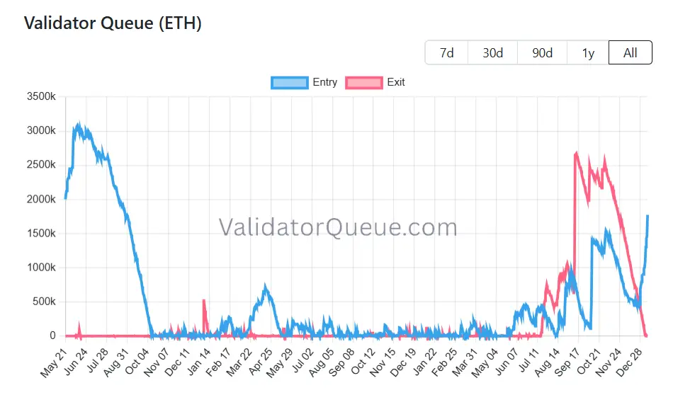 Рост эфира во многом связан с окончанием эпопеи, связанной с большой очередью на выход валидаторов из стейкинга. Показатель резко увеличился в сентябре после проблем, возникших у одного из крупнейших стейкеров ETH, компании Kiln. На начало января очередь на выход из стейкинга = 96, что в 27847 раз меньше, чем на максимуме 13 сентября. Одновременно со снижением очереди на выход валидаторов увеличилась очередь на вход — со 110 778 в начале октября до 1,78 млн сейчас. Это бычий сигнал, так как большее число стейкеров стремится заблокировать активы, а значит, они будут выведены из циркулирующего обращения.