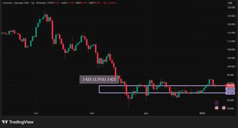 С 1 по 9 января 2026 года биткоин вырос на 3,91%. Первая криптовалюта снова торгуется выше психологически важной отметки $90 000. 5 и 6 января крупнейший криптокоин и вовсе поднимался выше $94 000, однако позже немного скорректировался.